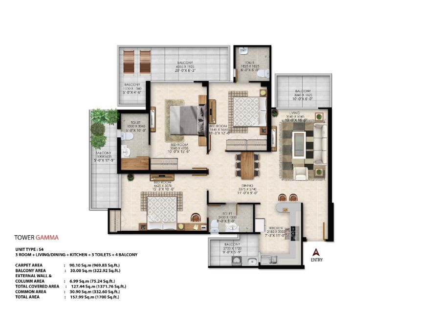3 BHK Flats: Sizes range from 1300 Sqft ensuring spacious living areas, natural ventilation, and abundant sunlight.